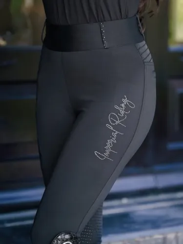 Korkeavyötäröiset ratsastuslegginsit tarjoavat mukavuutta ja tyyliä jokaiseen harjoitteluun. Kevyt ja hengittävä kangas on joustava sekä takaa vapaan liikkumisen. Kivet ja glitteryksityiskohdat antavat eleganttisen ilmeen, samalla aikaa kun silikoninen täysgrip takaa varman pidon satulassa.
