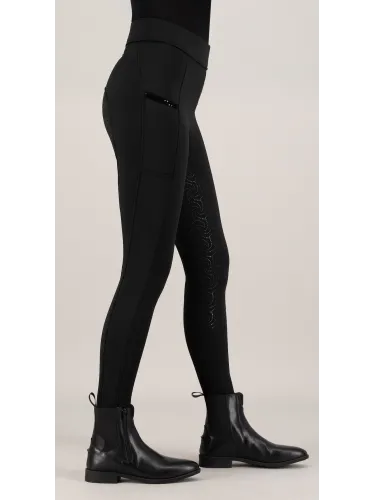 Korkeavyötäröiset ratsastuslegginsit tarjoavat mukavuutta ja tyyliä jokaiseen harjoitteluun. Kevyt ja hengittävä kangas on joustava sekä takaa vapaan liikkumisen. Kivet ja glitteryksityiskohdat antavat eleganttisen ilmeen, samalla aikaa kun silikoninen täysgrip takaa varman pidon satulassa.