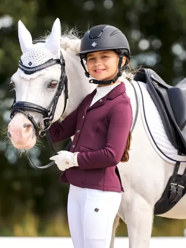 Kilpailutakki yhdistää keveyden, mukavuuden ja glamourin kilpailuratsastamiseksi. Ultrakevyt kangas neljässä suunnassa venyvällä ja hengittävällä verkkomateriaalilla takaa maksimaalisen liikkumisvapauden ja mukavuuden. Kristalleilla koristellut napit ja satiininen kaulus lisäävät eleganttista kiiltoa sekä muotoilu on luotu urheilulliseksi ja tyylikkääksi ilmeeksi.