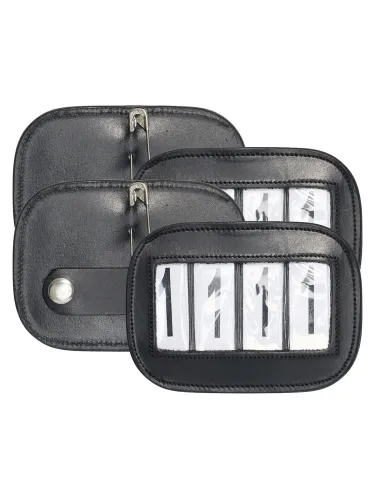 Klassinen kilpailunumeron pidike nahkapintaisella ulkokerroksella. Turvaneulalla ja nepparilla varustettu kiinnitysjärjestelmä pitää numeron tukevasti paikallaan. Sopii enintään kolmelle numerolle ja myydään settinä.