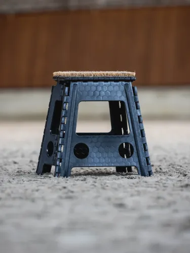 Käytännöllinen kokoontaitettava jakkara kookospalmuisella jalkamatolla.