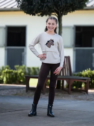 Lasten ratsastuslegginsit harjatulla vuorella. Matkapuhelintasku ja hevosenpää kirjonta lisäävät käytännöllisyyttä ja tyyliä.
